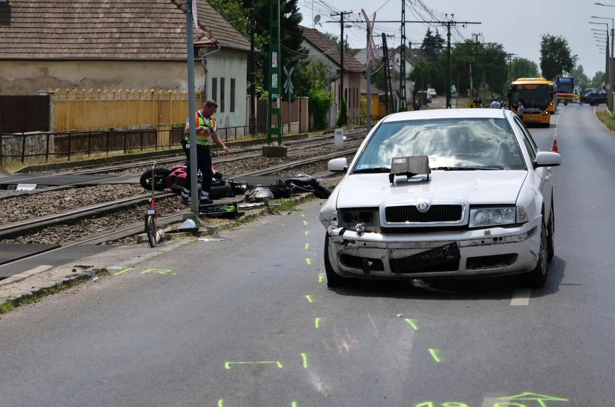 Frontálisan ütközött egy motorkerékpár és egy autó Soroksáron, a Haraszti úton, a motor a HÉV-sínekre zuhant - közölte a katasztrófavédelem csütörtök délelőtt az MTI-vel.