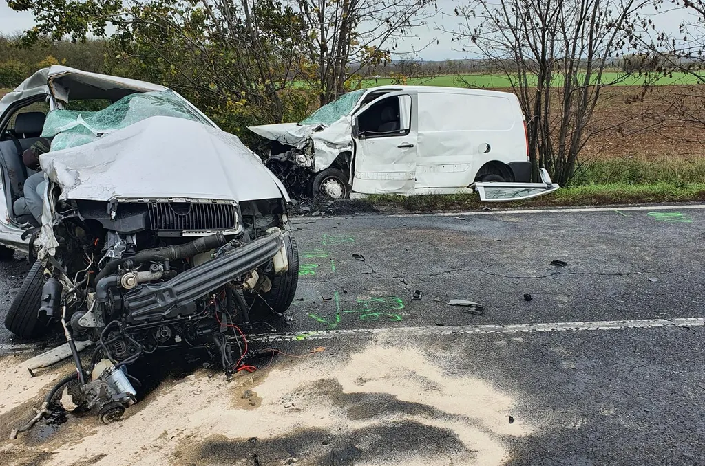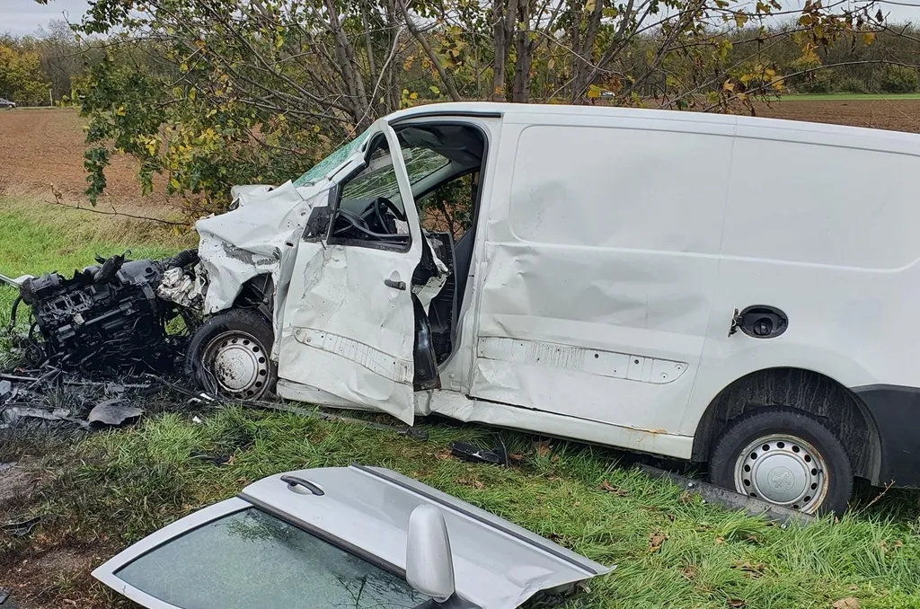 Az ütközés olyan erejű volt, hogy a szürke kocsi jobb oldala hatvan centiméterre, a váltóig benyomódott, a kisteherautó motorja pedig kiszakadt.