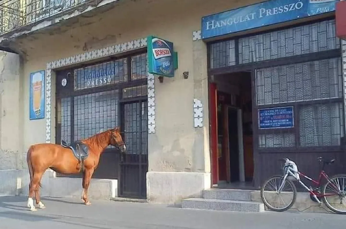 A fénykép tanulsága szerint többen is betértek aznap a Hangulat Presszóba, ki így, ki úgy. A vendégek jobb híján az ivó elé parkoltak járműveikkel, így tett az a szomjas jövevény is, aki lóháton galoppolt a sörözőig.