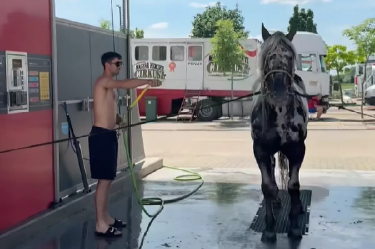 Humoros videó terjed a közösségi oldalakon, melyen Ifj. Richter József cirkuszigazgató lovat csutakol egy autóknak kialakított mosóban.