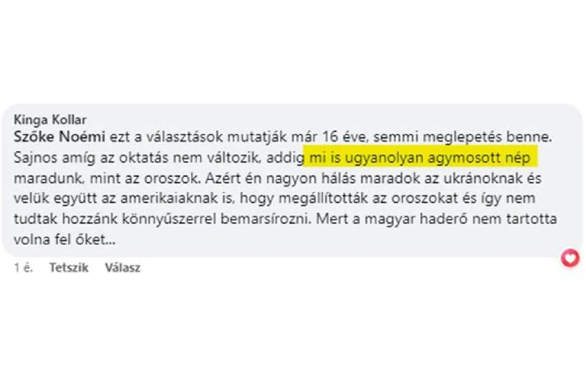 „Sajnos amíg az oktatás nem változik, addig mi is ugyanolyan agymosott nép maradunk, mint az oroszok. Azért én nagyon hálás maradok az ukránoknak és velük együtt az amerikaiaknak is, hogy megállították az oroszokat és így nem tudtak hozzánk könnyűszerrel bemarsírozni. Mert a magyar haderő nem tartotta volna fel őket.”