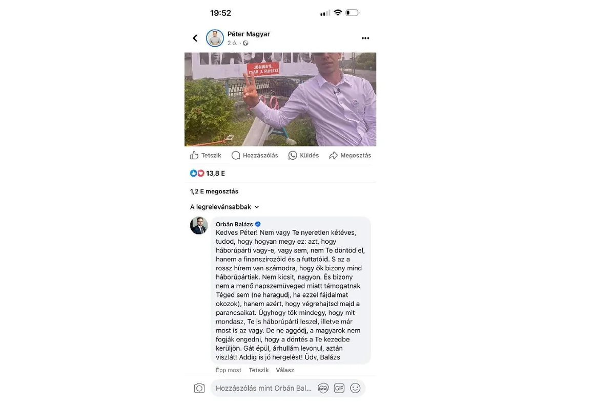 „Úgyhogy tök mindegy, hogy mit mondasz, te is háborúpárti leszel, illetve már most is az vagy. De ne aggódj, a magyarok nem fogják engedni, hogy a döntés a te kezedbe kerüljön. Gát épül, árhullám levonul, aztán viszlát! Addig is jó hergelést! Üdv, Balázs” – írta Magyar Péternek Orbán Balázs, aki a jelek szerint még fideszes korában is ismerte a baloldali politikust.