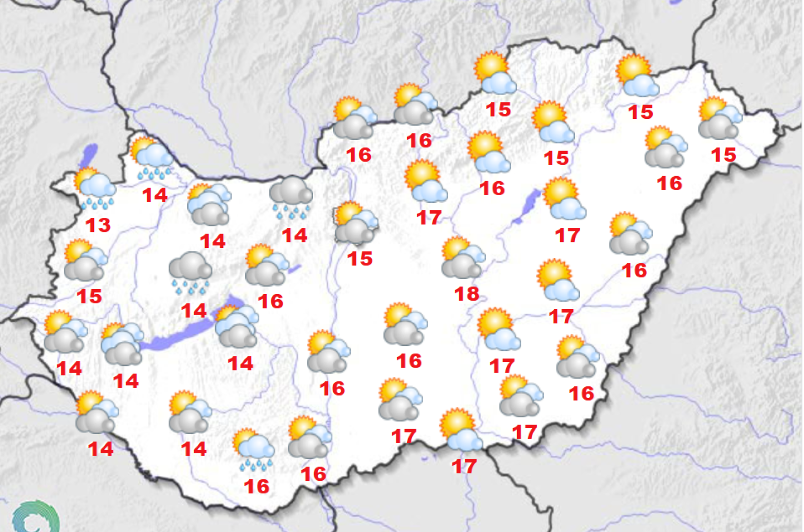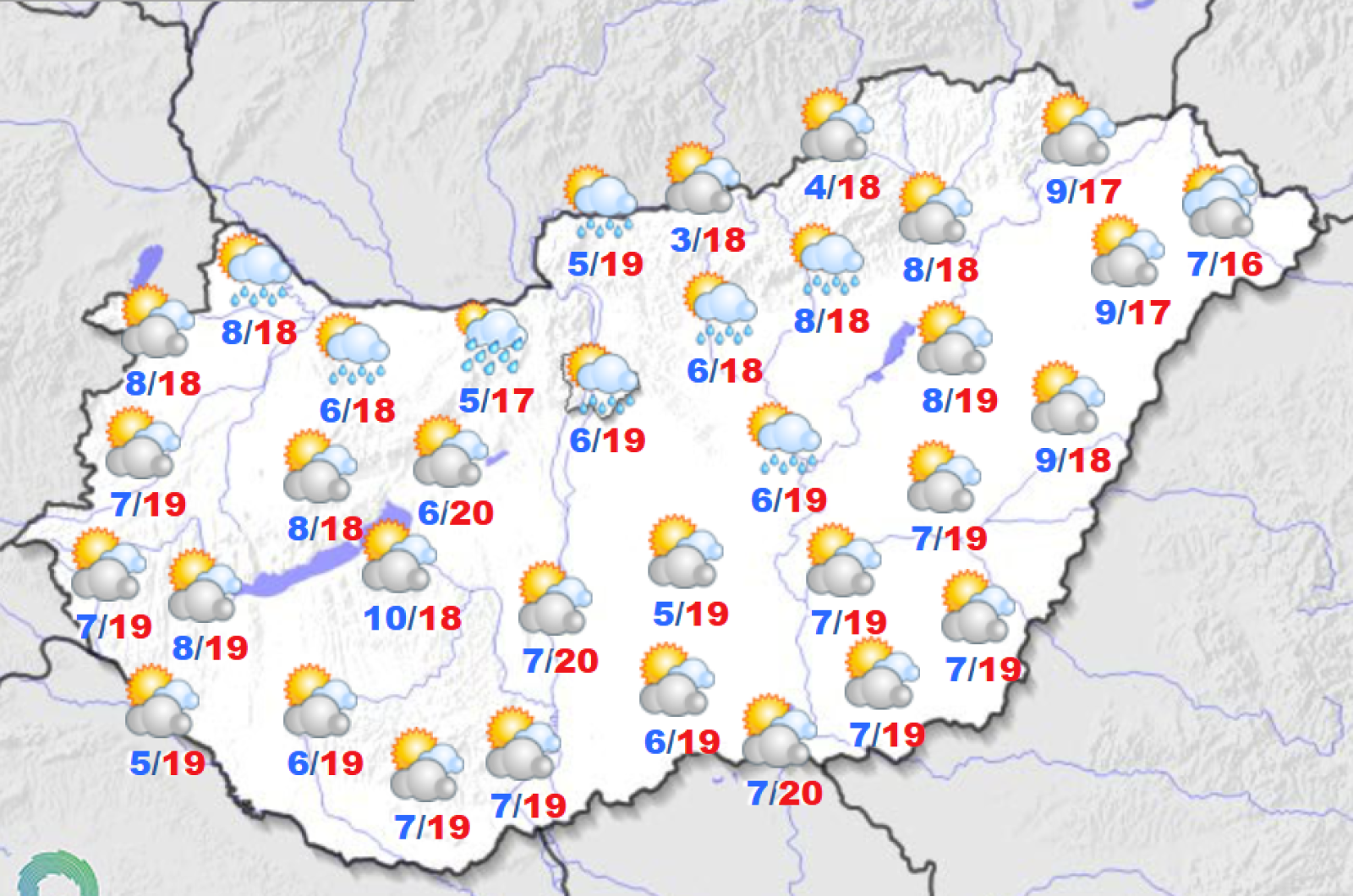 Hétfőn a köd, valamint rétegfelhőzet fokozatosan feloszlik, a kezdeti kevésbé felhős, naposabb – főleg dunántúli – tájakon ismét egyre több felhő képződik, illetve sodródik fölénk északnyugat felől. Nagyobb eséllyel a Dunántúlon fordulhat elő helyenként futó zápor, míg a keleti országrészben kicsi a csapadék esélye, ott süthet a legtöbbet a nap. Az északnyugati szelet - az északkeleti harmad és a délnyugati tájak kivételével - nagy területen élénk, olykor erős, néhol viharos lökések kísérhetik. Délután 13-18 fok között tetőzik a hőmérséklet.