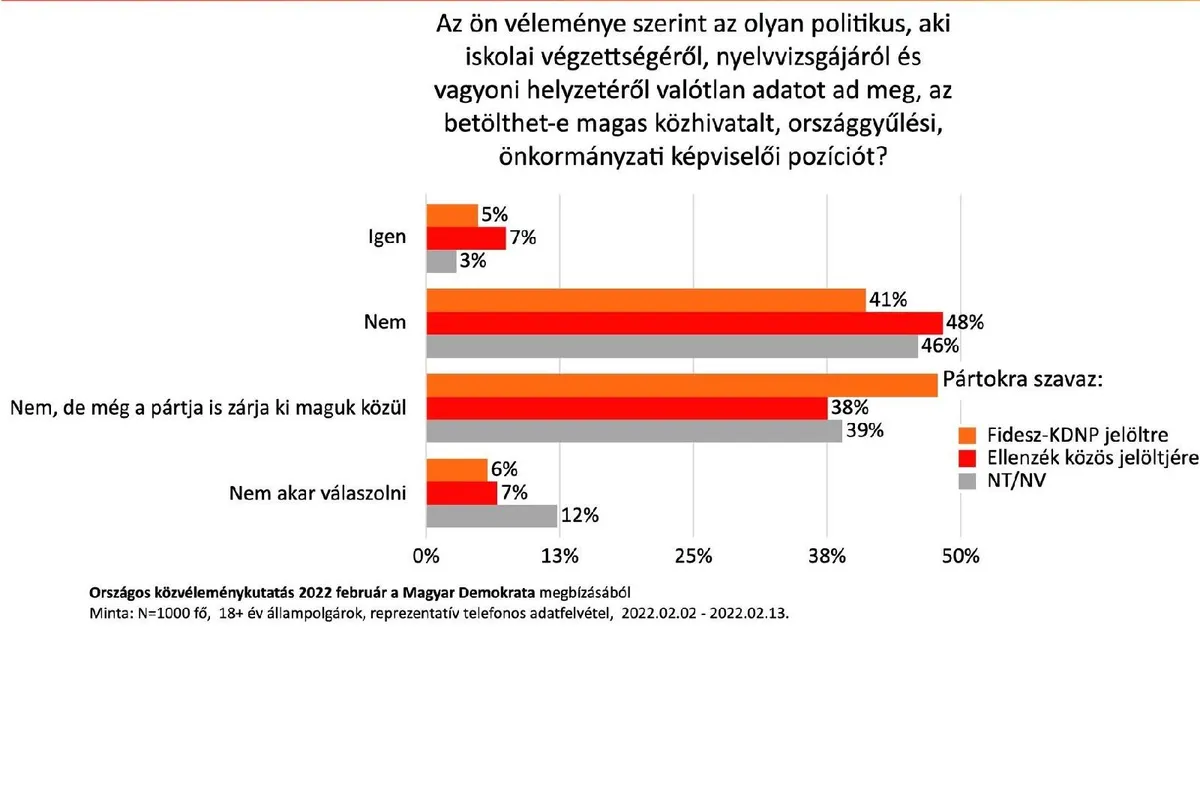 A felmérésben résztvevők 44 százaléka szerint nem tölthet be magas közhivatalt, országgyűlési, önkormányzati képviselői pozíciót olyan politikus, aki iskolai végzettségéről, nyelvvizsgájáról és vagyoni helyzetéről valótlan adatot ad meg.