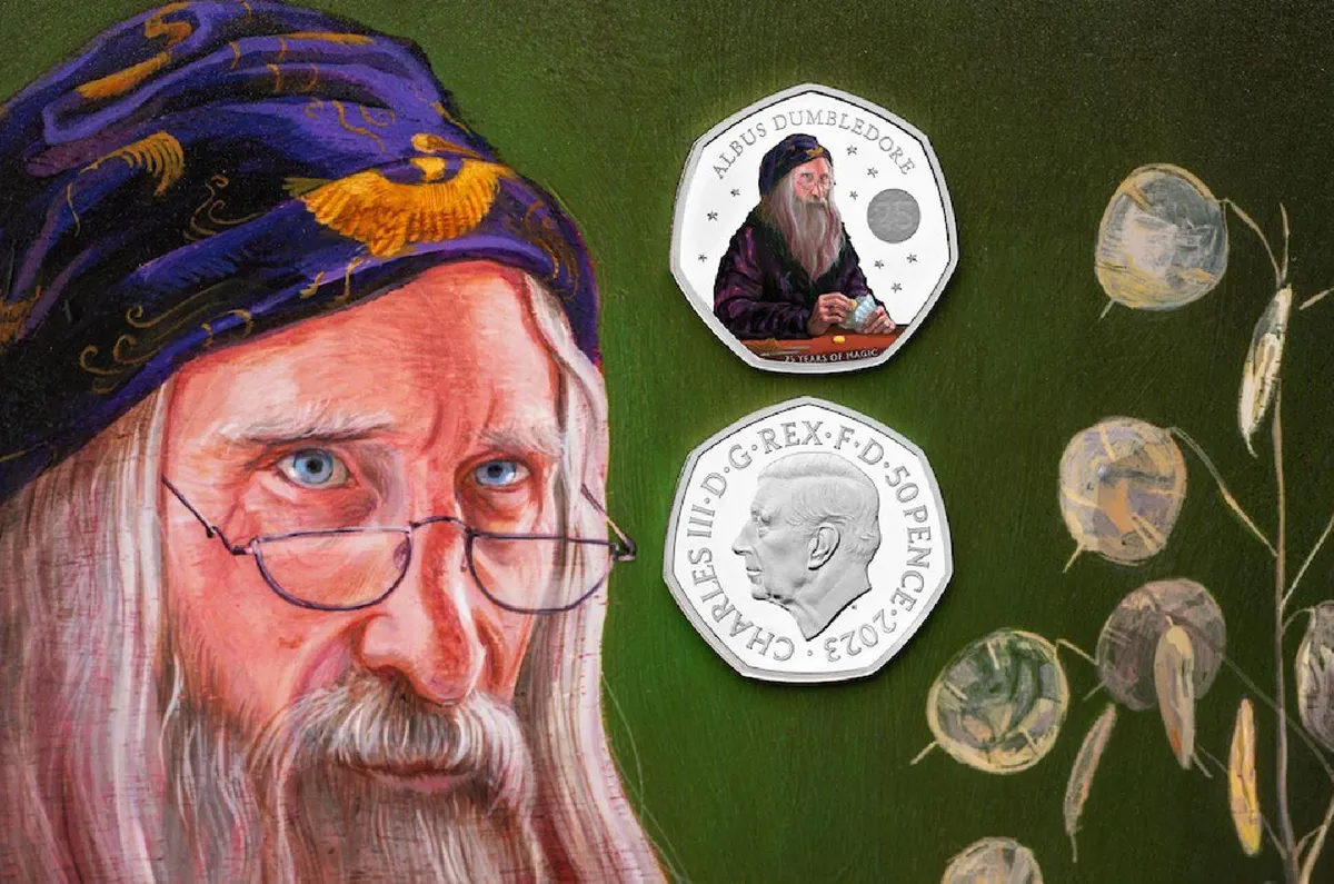 A király az érme fej nevű oldalán látható, a Roxfort varázslóiskola igazgatójának arcmása a túloldalon. A Royal Mint, azaz a brit Királyi Pénzverde közlése szerint a Harry Potter-kollekció egyike azon kevés érmesorozatnak, amelyikben egyik érméről a másikra megváltozik az uralkodó portréja.