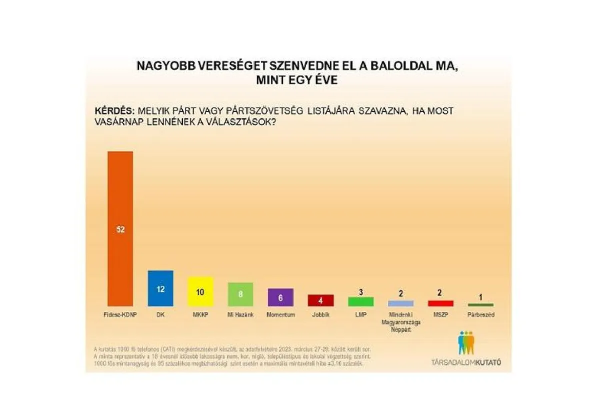 Mint jelezték, a Társadalomkutató a 2022-es áprilisi választás legpontosabb előrejelzését adta, s az egyéves évforduló alkalmából ismét megmérte a magyar társadalom politikai preferenciáit. Ebből kiderült, hogy a Fidesz–KDNP pártszövetségre egy most vasárnapi választáson az urnához járulók 52 százaléka szavazna, amely hibahatáron belül tér csak el a Társadalomkutató által a választás előtt mért 50 százalékos támogatottságtól és az 52,5 százalékos tényleges belföldi választási eredménytől.