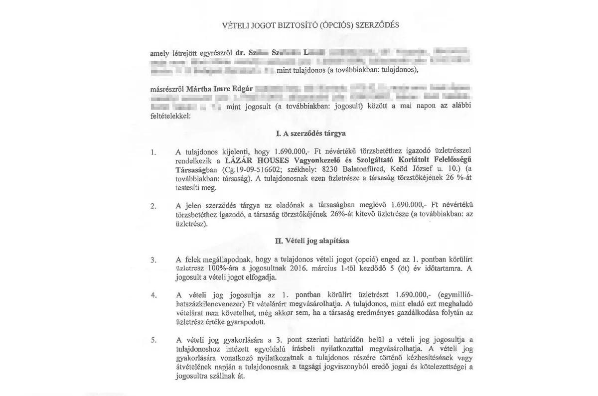 A szerződés szerint a Lázár Houses-ban 26 százalék részesedést tulajdonoló dr. SZ.SZ.L. ügyvéd öt évre, egy meghatározott – nevetségesen alacsony – összegért opciós vételi jogot biztosít erre a tulajdonrészre Mártha Imrének, aki potom 1 690 000 forintért bármikor megvásárolhatja azt. Pontosabban visszavásárolhatja, hiszen a cégtörténet alapján éppen Mártha Imrétől, illetve közvetlen családtagjától „vásárolta”, azaz íratta a nevére az üzletrészt az ügyvéd stróman, így segítve eltüntetni egy hatalmas, milliárdokat érő vagyonrészt.