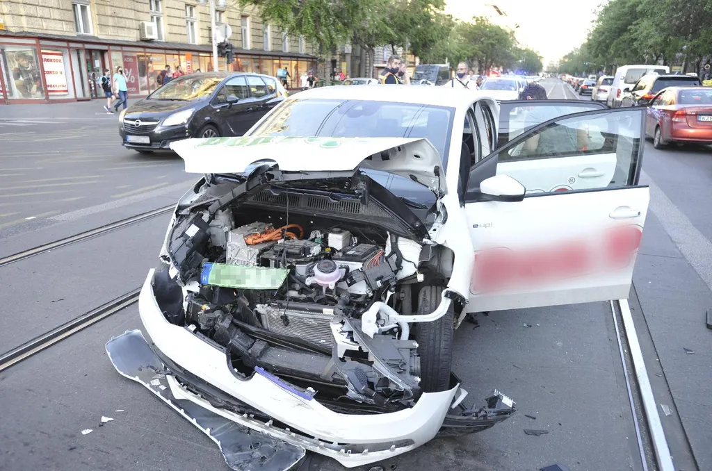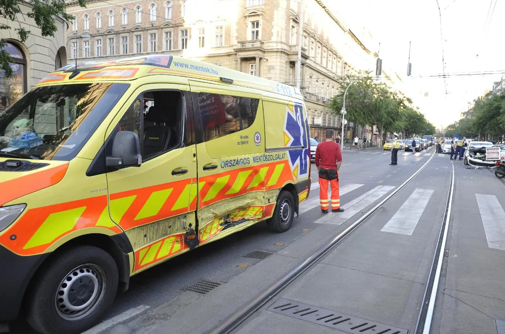 A Budapesti Rendőr-főkapitányság (BRFK) közleménye szerint egy személygépkocsi és egy fény- és hangjelzést használó mentőautó ütközött össze a Podmaniczky utca és a Teréz körút kereszteződésében.