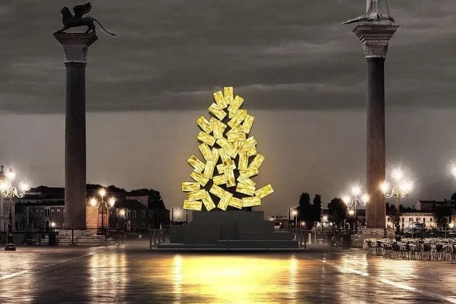 A gyakran megdöbbentő alkotásokkal előrujjoló Fabrizio Plessi alkotása ez a digitális installáció, ami elmondása szerint a fény emlékezete, és az újjászületés reménye. Nyolcvan darab ledes modulból áll, melyeken esténként különböző irányokba hullámzik az arany. A művésznek volt már korábban is egy hasonló installációja a Correrben, aholaz ablakokban arany vízesés ömlött folyamatosan. De folyt már arany folyója a Ca'd'Oro-ban is.