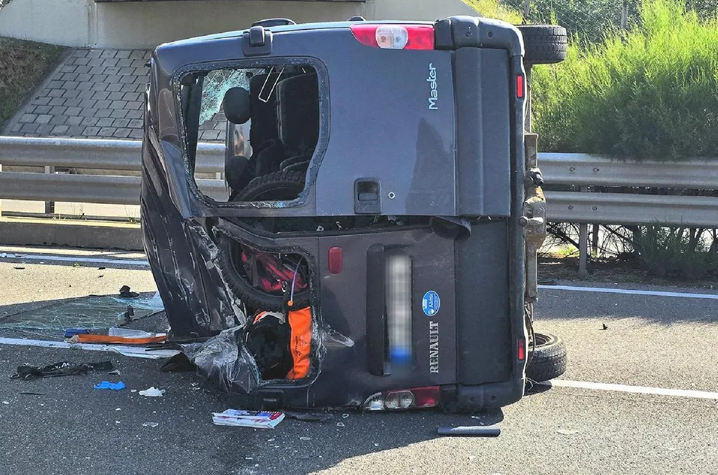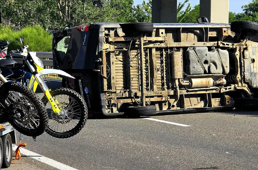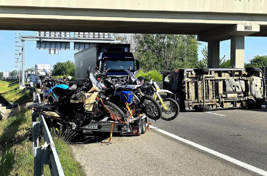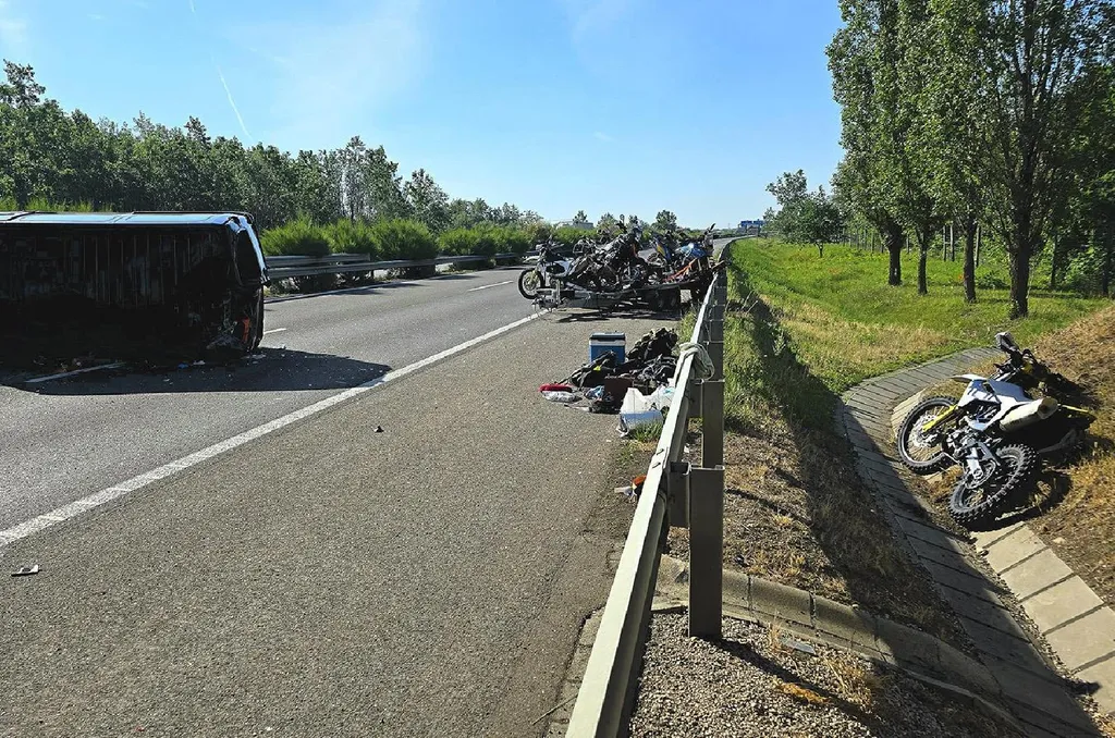 Kifejtve, hogy ezután a kisbusz a sztráda közepén az oldalára borult, a vontatott tréler leszakadt a rajta szállított crossmotorokkal együtt, de volt amelyik motor az útszéli árokba repült.