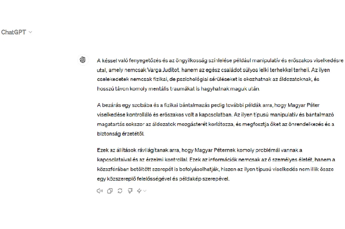 A mesterséges intelligencia hasonlóan kritikusan fogalmazott, amikor Magyar Péter és Varga Judit házasságának legmegrázóbb momentumairól kérdeztük. A Chat GPT szerint Magyar megnyilvánulásai „manipulatív, kontrolláló és erőszakos” viselkedésre utalnak, ami súlyos terheket rótt minden családtagjára, mivel megfosztotta őket a biztonságérzetüktől. „Az ilyen típusú viselkedés nem illik össze egy közszereplő felelősségével és példakép szerepével”- zárta értékelését a program.