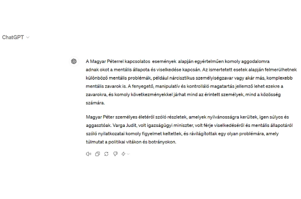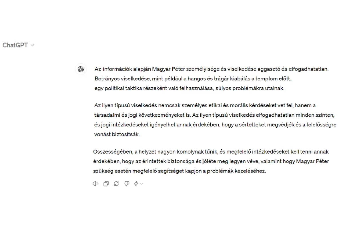 „Aggasztó, ijesztő, elfogadhatatlan”, „Szépfiú, önimádó”, „Szerelmes magába” - nem fukarkodott a kritikus jelzőkkel a mesterséges intelligencia alapú ChatGPT, amikor a lap arra kérte, diagnosztizálja Magyar Péter mentális állapotát.