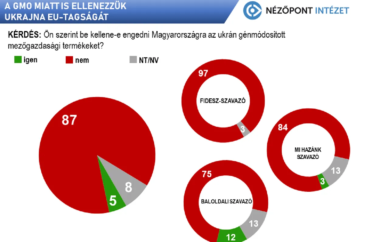 A kutatás szerint nincs olyan kiemelt társadalmi csoport nem, kor, végzettség és településtípus alapján, amelyben az ukrán génmódosított mezőgazdasági termékek Magyarországra engedését a többség támogatná. Még a felsőfokú végzettségűek és a fővárosiak négyötöde (82-82 százalék) is tiltakozik a brüsszeli vezetés javaslata ellen - áll a felmérés eredményét ismertető összefoglalóban.
