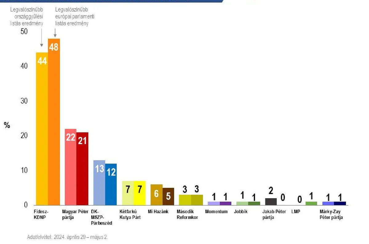 A baloldali pártok támogatottságát tekintve nem mutatkozik jelentős különbség egy „most vasárnapi” országgyűlési és európai parlamenti választás esetében. Magyar Péter pártja (22 százalék) és a DK-MSZP-P koalíció (13 százalék) is csupán 1-1 százalékponttal érne el magasabb arányt egy országgyűlési, mint az EP-választáson. A többi baloldali párt közül egyedül az MKKP (7 százalék) jutna be önállóan a magyar országgyűlésbe is.