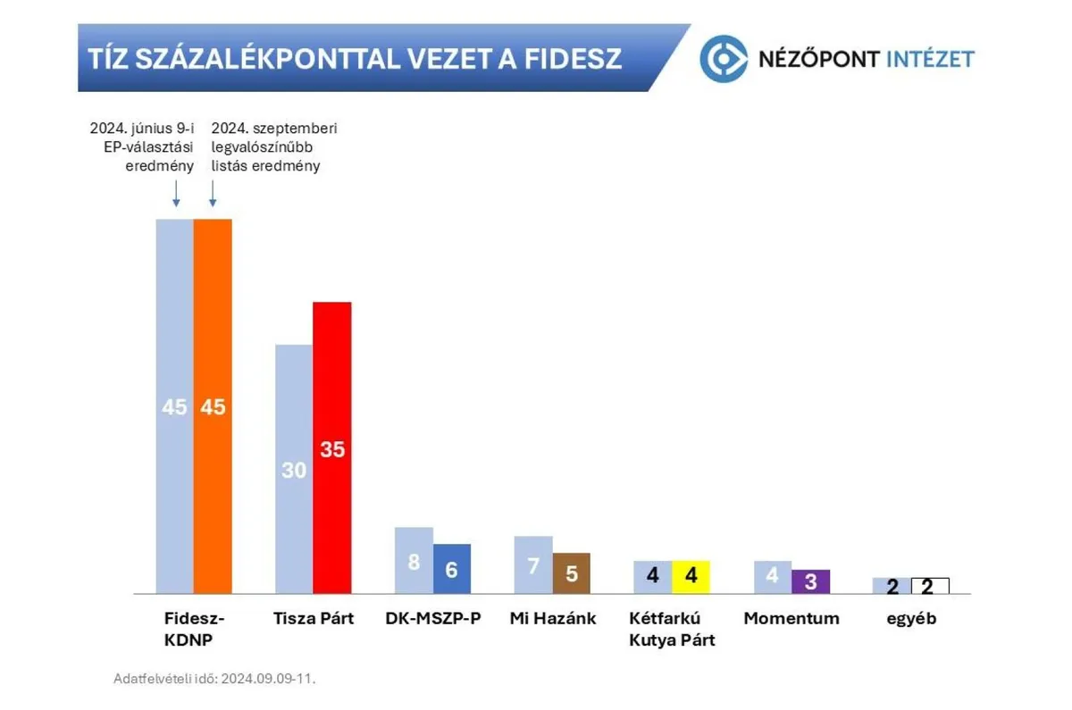Az Nézőpont Intézet kutatása 2024. szeptember 9. és 11. között, 1000 fő telefonos megkérdezésével készült. A minta reprezentatív a 18 évesnél idősebb lakosságra nem, kor, régió, településtípus és iskolai végzettség szerint. 1000 fős mintanagyság és 95 százalékos megbízhatósági szint esetén a mintavételi hiba ± 3,16 százalék. Az adatok kerekítve lettek egész számra, ezért előfordulhat, hogy összeadott értékük nem pontosan 100. Bázis = magyar választók, a választási részvételüket egy országgyűlési választáson biztosra ígérő válaszadók.