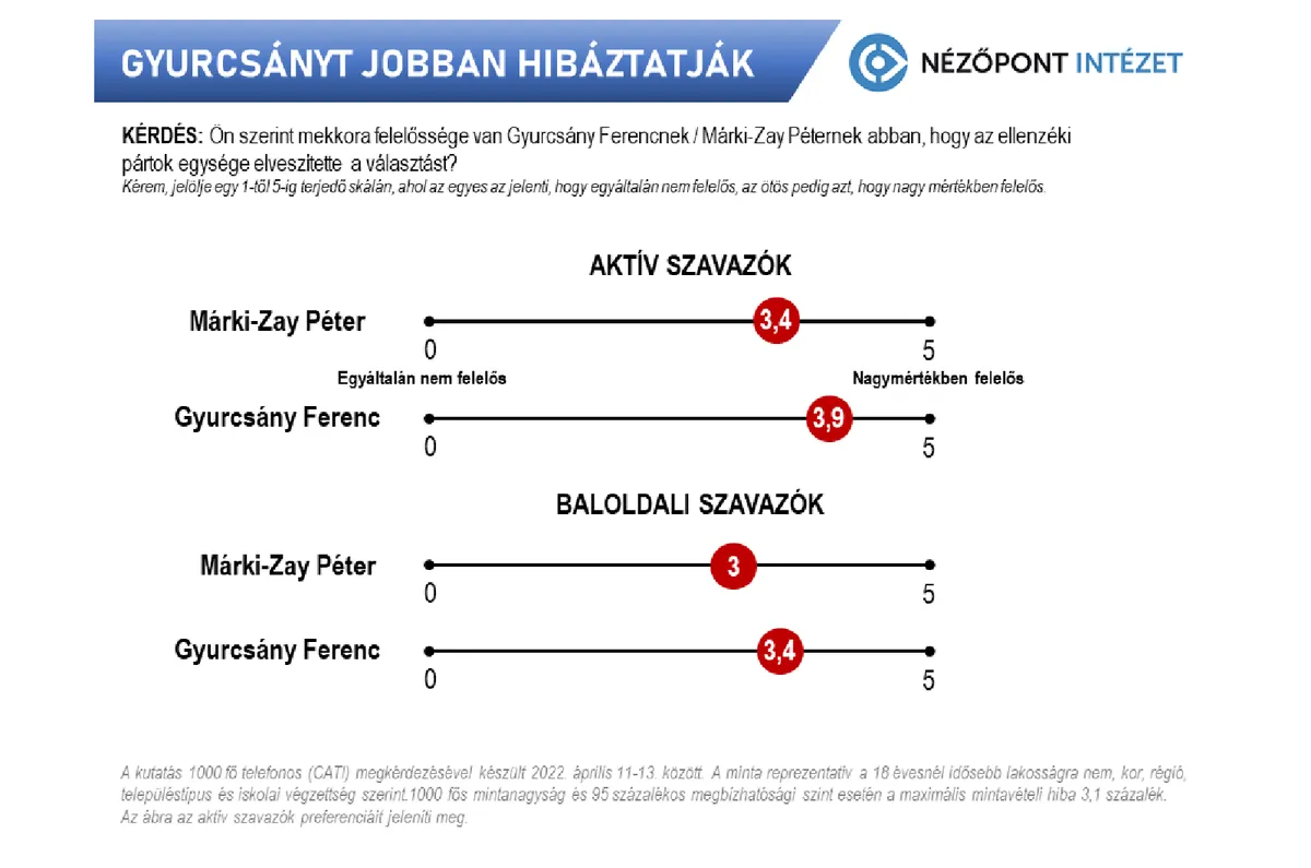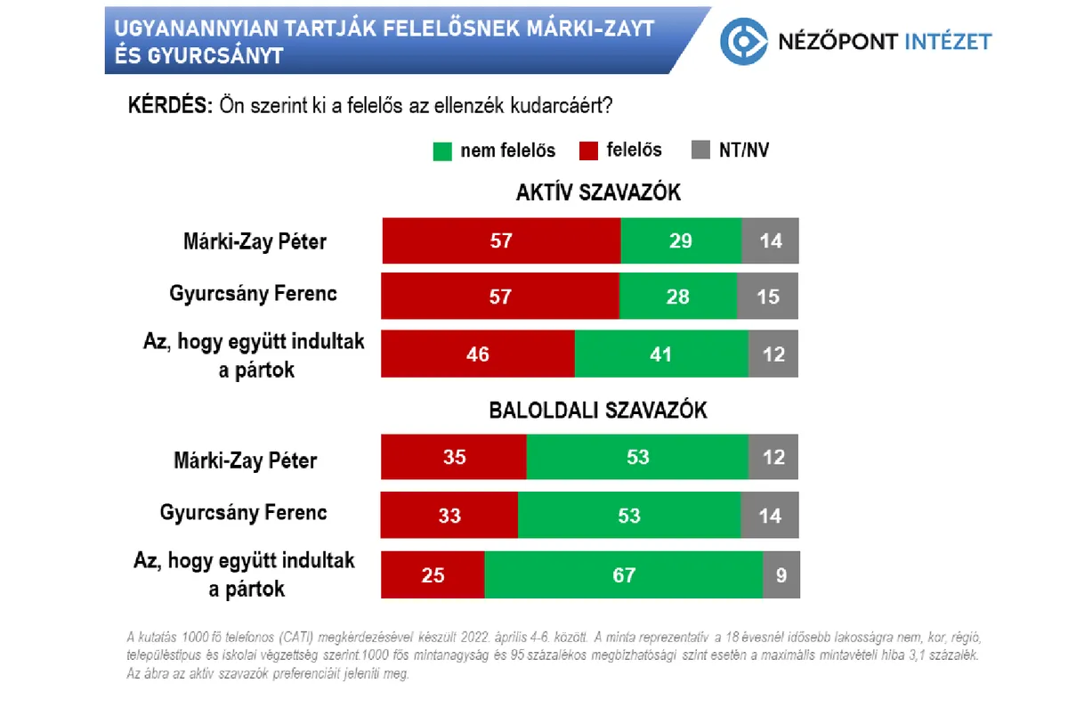 A Nézőpont szerint a baloldali táboron belüli feszültségre utal, hogy még a baloldali szavazók egyharmada is felelősnek tartja a két politikus valamelyikét. Gyurcsány Ferencet a baloldali választók 33 százaléka, Márki-Zay Pétert a 35 százaléka tartja felelősnek az ellenzéki bukásért. Mindkét esetben a baloldal aktív szavazóinak 53 százaléka vélekedett úgy, hogy nem felelősek a kudarcért, tehát másban látják a vereség okát - fűzték hozzá.