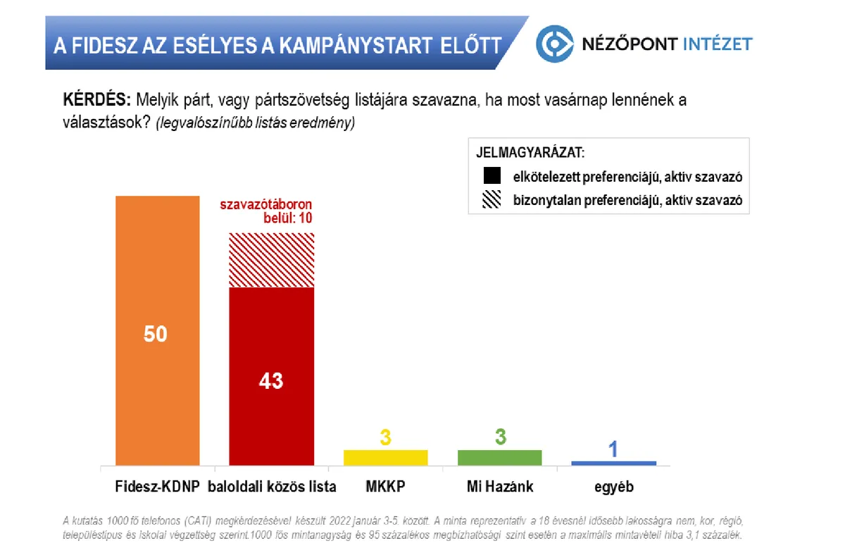 A Nézőpont Intézet előrejelzése szerint, ha „most vasárnap” lenne a választás, minden második, belföldi szavazó a Fidesz és a KDNP közös listájára szavazna (50 százalék). Ők elkötelezett szavazónak számítanak, a kormánnyal is elégedettek és Orbán Viktor miniszterelnökségét is határozottan támogatják. Mivel négy éve a belföldi aktív választópolgárok 47,36 százaléka szavazott az akkori és mostani kormánypártokra, ez majdnem három százalékpontos emelkedést, s a Fidesz szinte biztosra vehető választási győzelmét jelenti.
