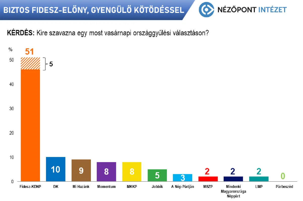 Az elemzés szerint a Fidesz-KDNP "toronymagasan" vezet, a kormánypártok szavazóinak kötődése azonban meggyengült. Mint írták, "most vasárnap" a magyarok 51 százaléka ugyan vélelmezhetően a Fideszre szavazna, de közülük minden tizedik (a választók 5 százaléka) ebben már nem biztos, a kormánypártot csak valószínűleg és nem biztosan támogatná.