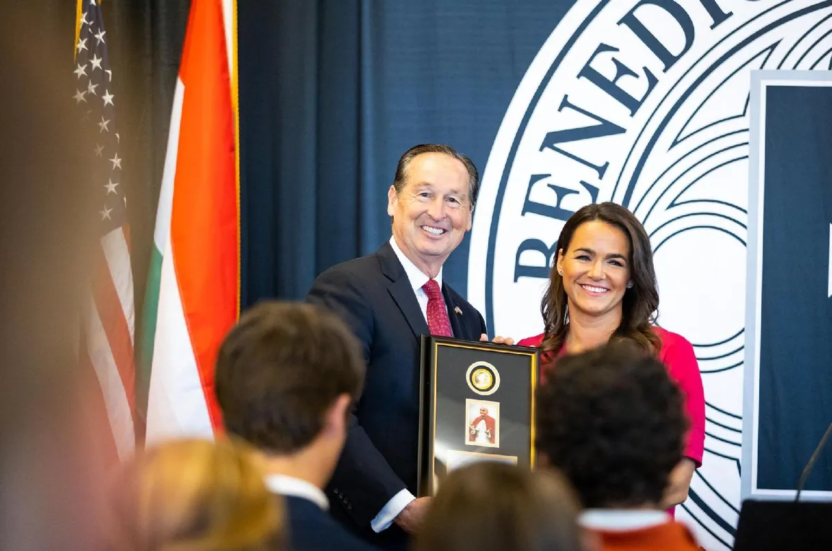 Az előadás végén Novák Katalin az intézmény elnökétől, Stephen D. Minnistől átvette a Benedictine College Szent II. János Pál pápáról elnevezett díját.
