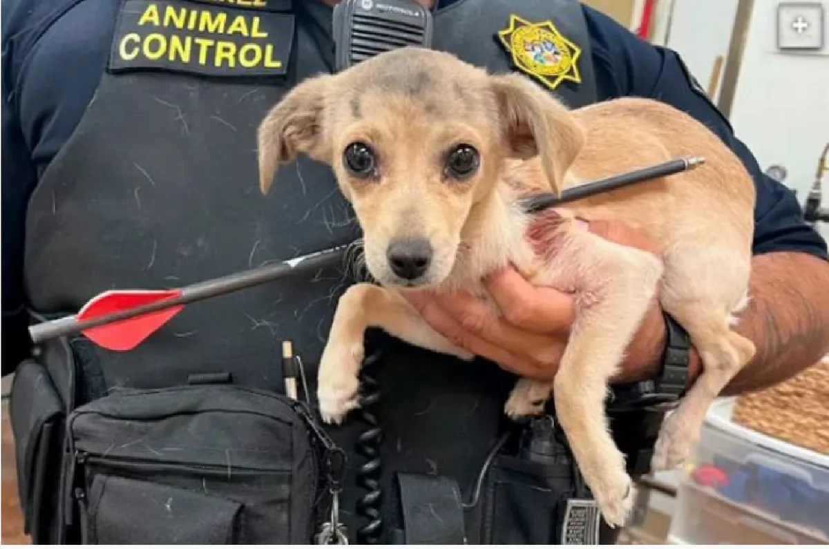 Az ott tartózkodó személyzet megállapította, hogy a nyíl nem találta el a kölyökkutya létfontosságú artériáit, így várhatóan életben marad.