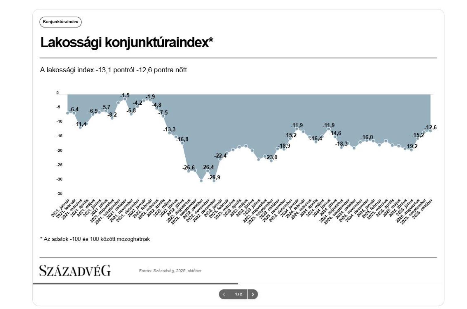 A lakossági konjunktúraindexnek három alindexe erősödött, egy alindex pedig gyengült októberben, az előző havi értékhez képest. A legkedvezőbb továbbra is a foglalkoztatási helyzet megítélése, amelynek értéke az előző havi −2,1-ről −0,7-re, a gazdasági környezet érzékelése októberben az előző havi −22,0-ről −21,2-re, míg az inflációs folyamatok észlelését jelző alindex −53,8-ről −53,3-re javult. Mindeközben az anyagi helyzet megítélése enyhén gyengült −8,7-ről −9,1-re.