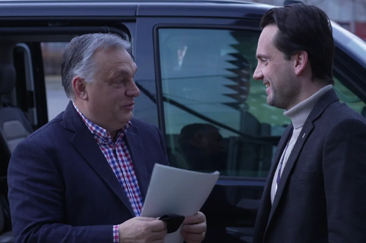 /Orbán Viktor pénteken reggel az MTVA székház előtt/