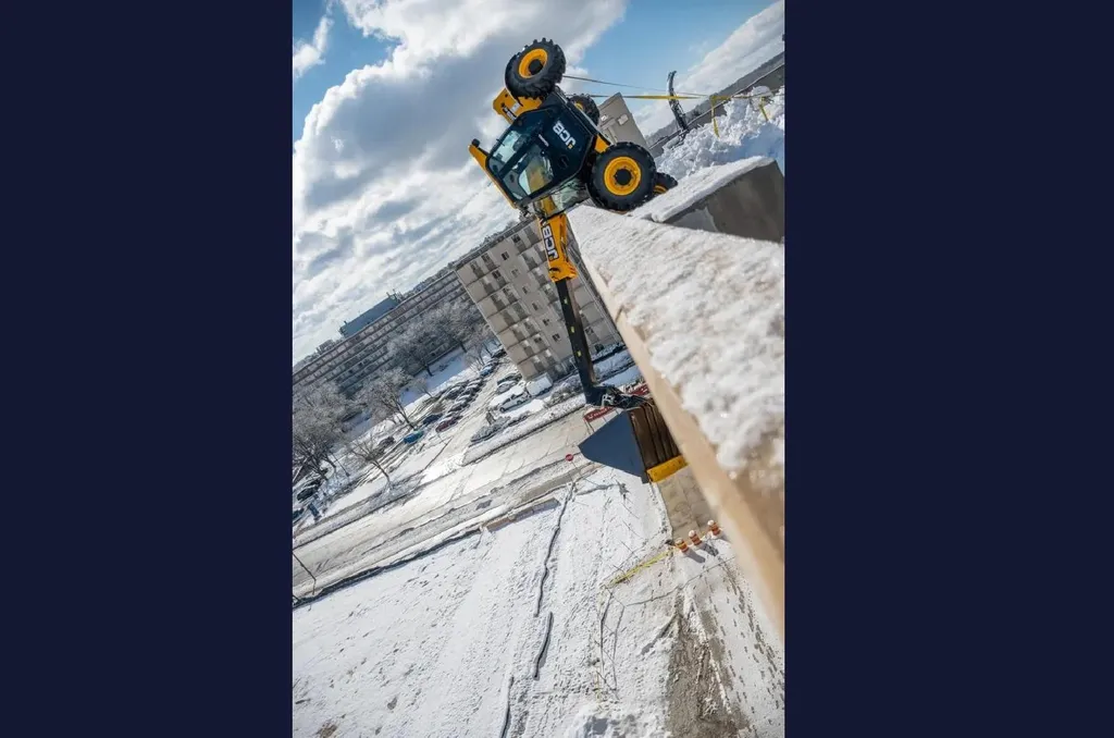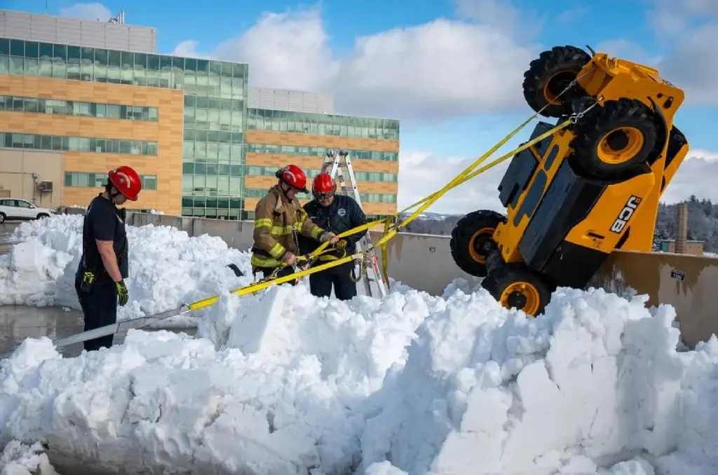 Egy adag havat akart a gépkezelő átemelni egy rámpán, amikor a hótúró kibillent az egyensúlyából, átborult rajta, és kis híján lezuhant a garázs a legfelső szintjéről.