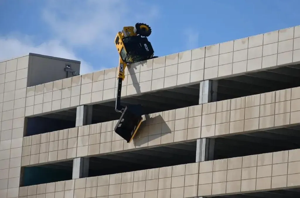 Parkolóház tetejéről lógott egy munkagép, ijesztő fotók készültek a helyszínen
