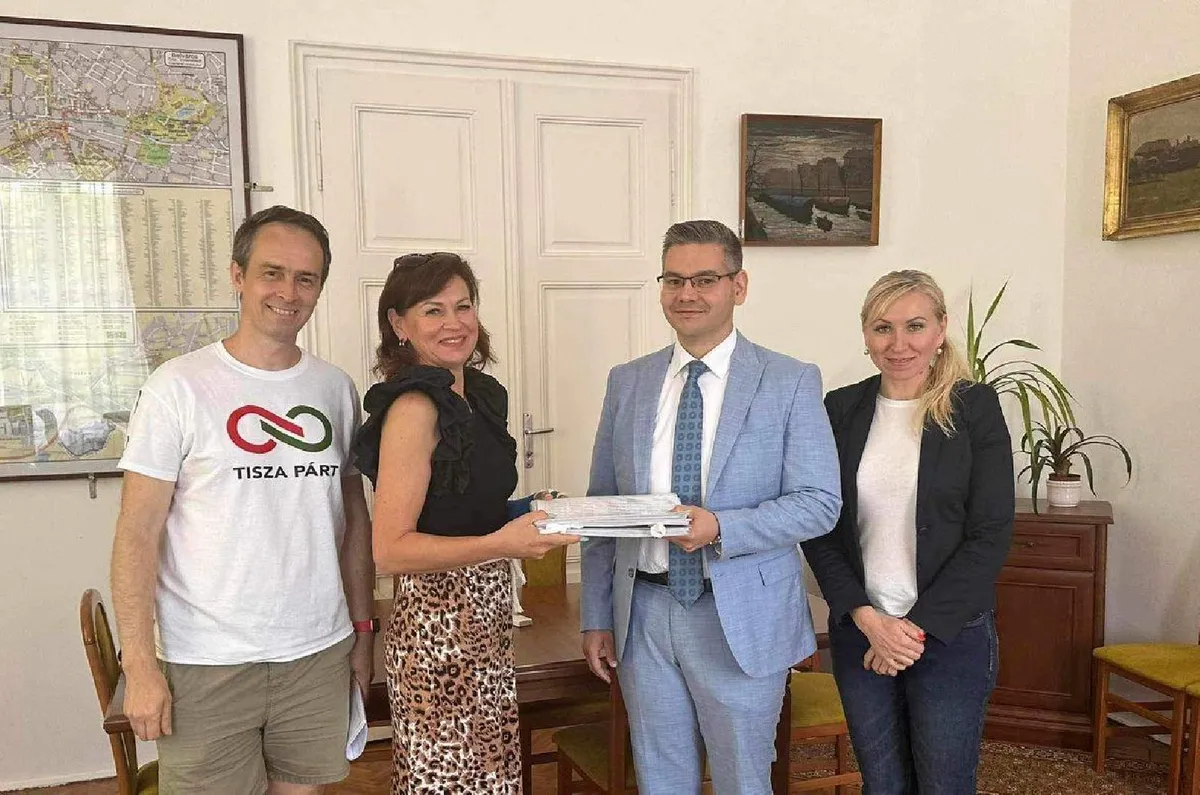 A lenti fotón látszódik, ahogy Strausz Róbert TISZA pártos pólóban, többedmagával adja át Csige Gábor jegyzőnek az induláshoz szükséges aláírásokat.
