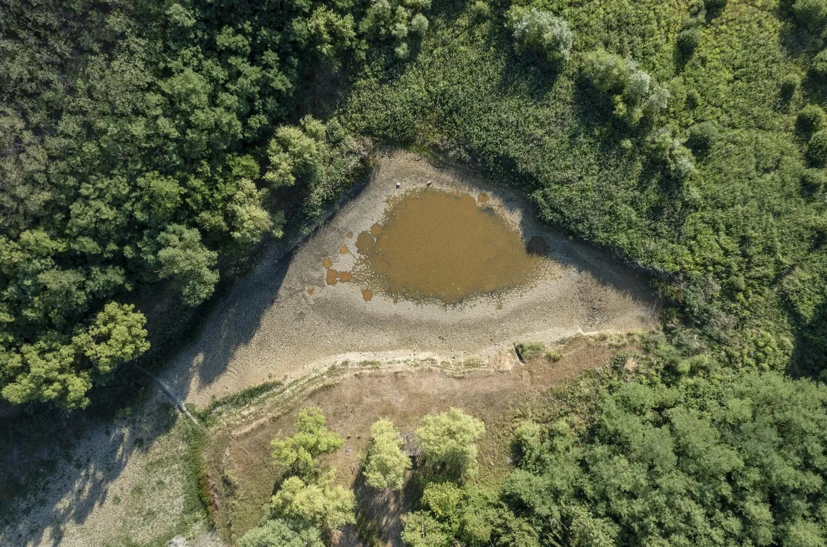 Fotó: A drónnal készített felvételen a kiszáradóban lévő Halda-tó Bátonyterenyén 2022. július 20-án. MTI/Komka Péter