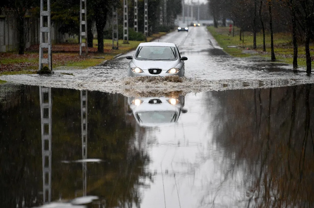 Egy jármű halad az összegyűlt csapadékvízben a Benczúr Gyula utcán Debrecenben 2022. december 11-én. MTI/Czeglédi Zsolt