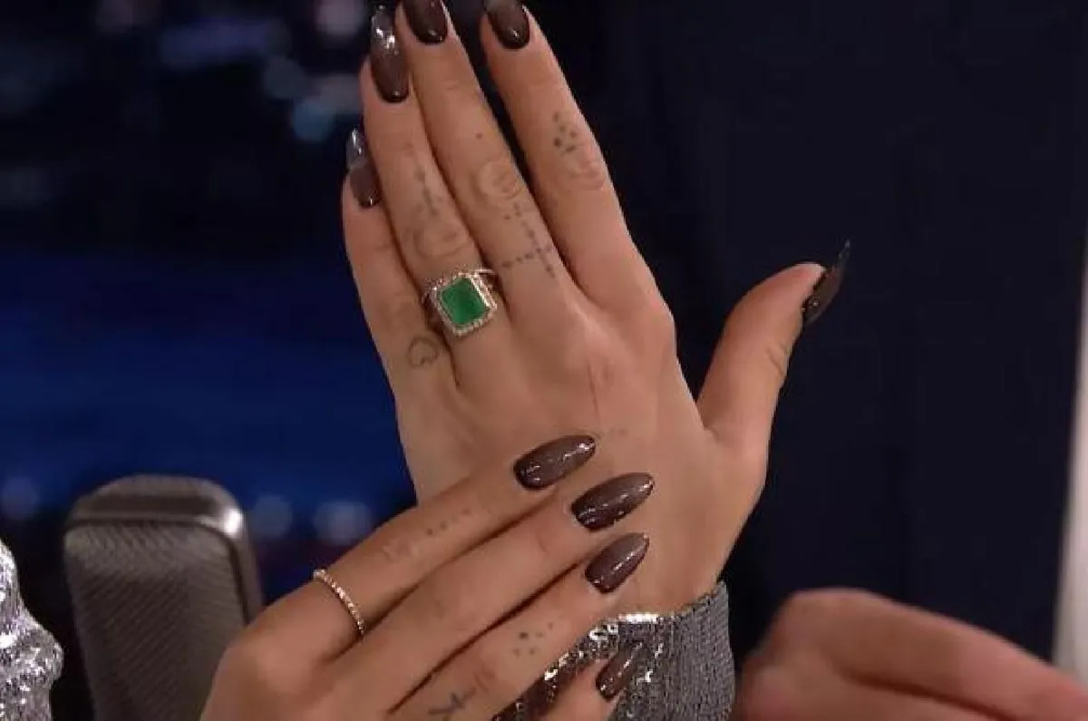 Így a szexi énekesnő megragadta az alkalmat és megmutatta gyönyörű, zöld smaragddal díszített gyűrűjét, mely úgy ragyog a kezén, akár egy csillag.