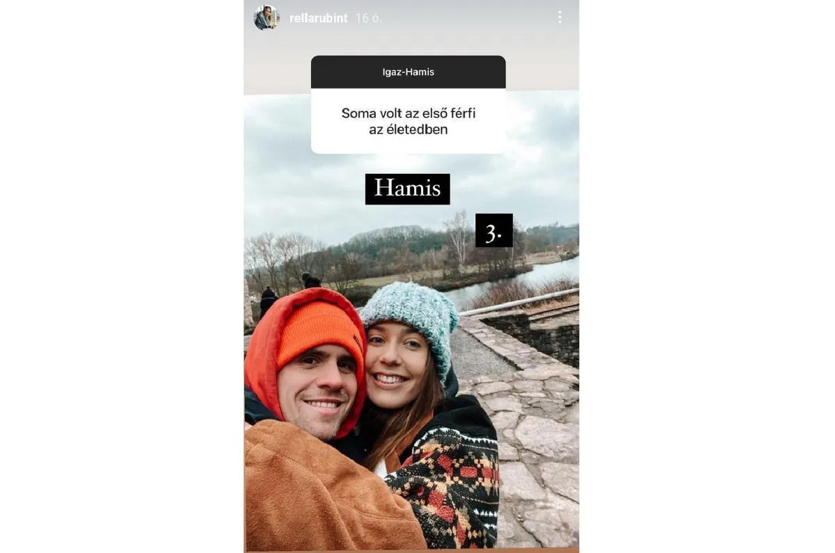 Sokmindent elárult oldalán, például, hogy nem terhes, és arra is fény derült, hogy még soha nem mentek szét jelenlegi párjával, Novothny Soma focistával, akivel nyárra tervezik az esküvőjüket. "Soma volt az első férfi az életedben" - írta az igaz-hamis játékban egy követő, a felvetésre pedig Rubint Rella hamis választ adott, valamint hozzátette, hogy Soma a harmadik az életében.