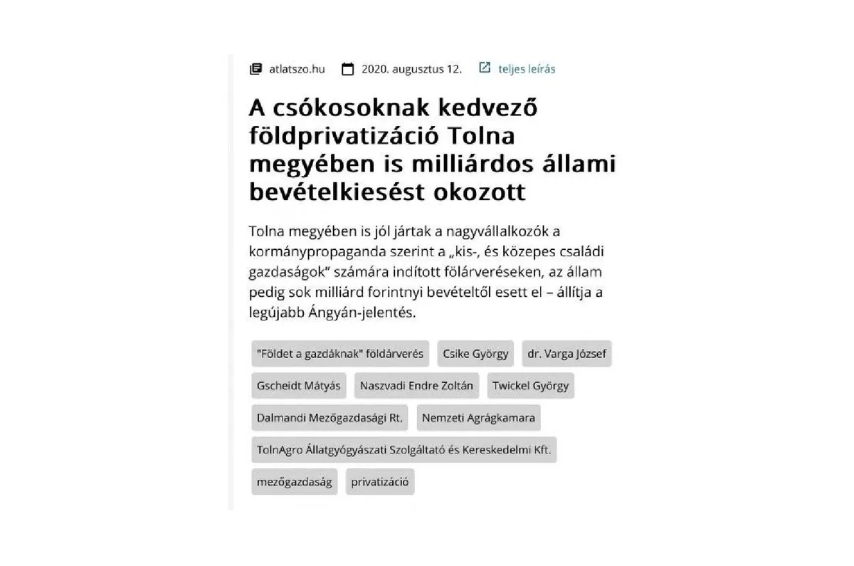 Arról 2020-ban az atlatszo.hu is beszámolt, hogy "Tolna megyében a földek 75%-át nem helybeli gazdálkodó családok, hanem más településen élő, tőkeerős árverezők szerezték meg.