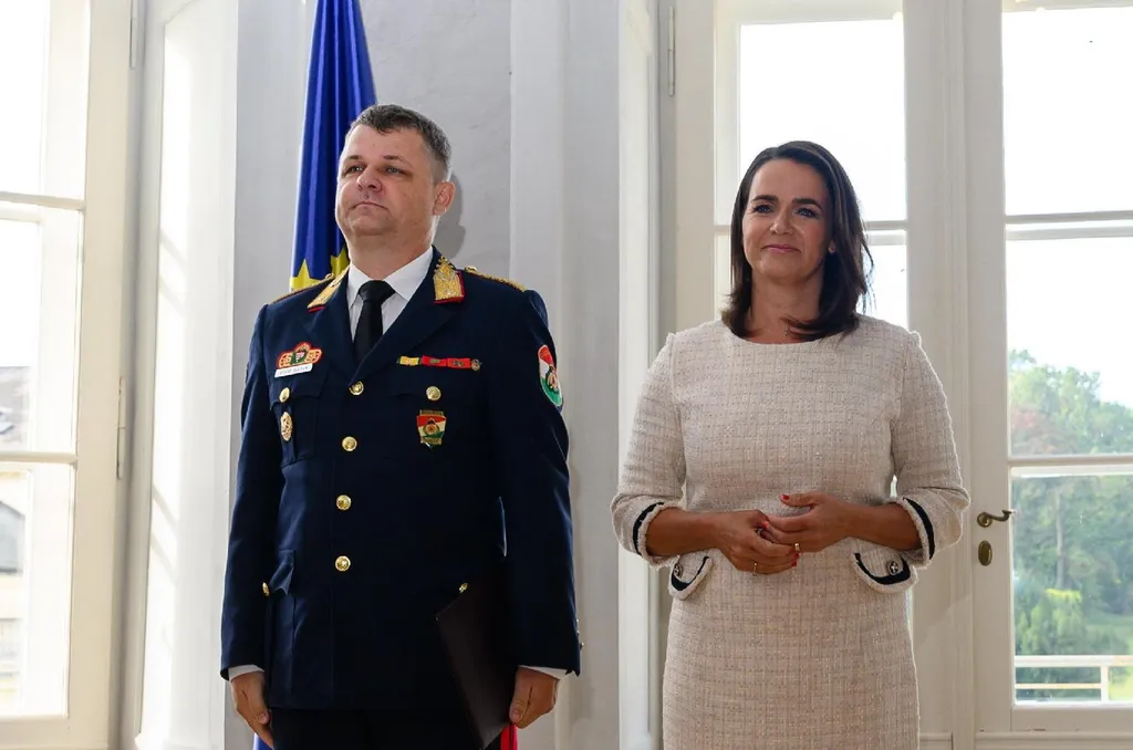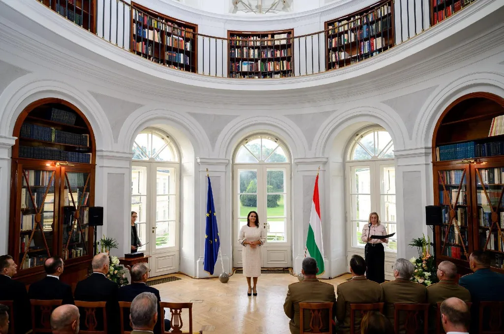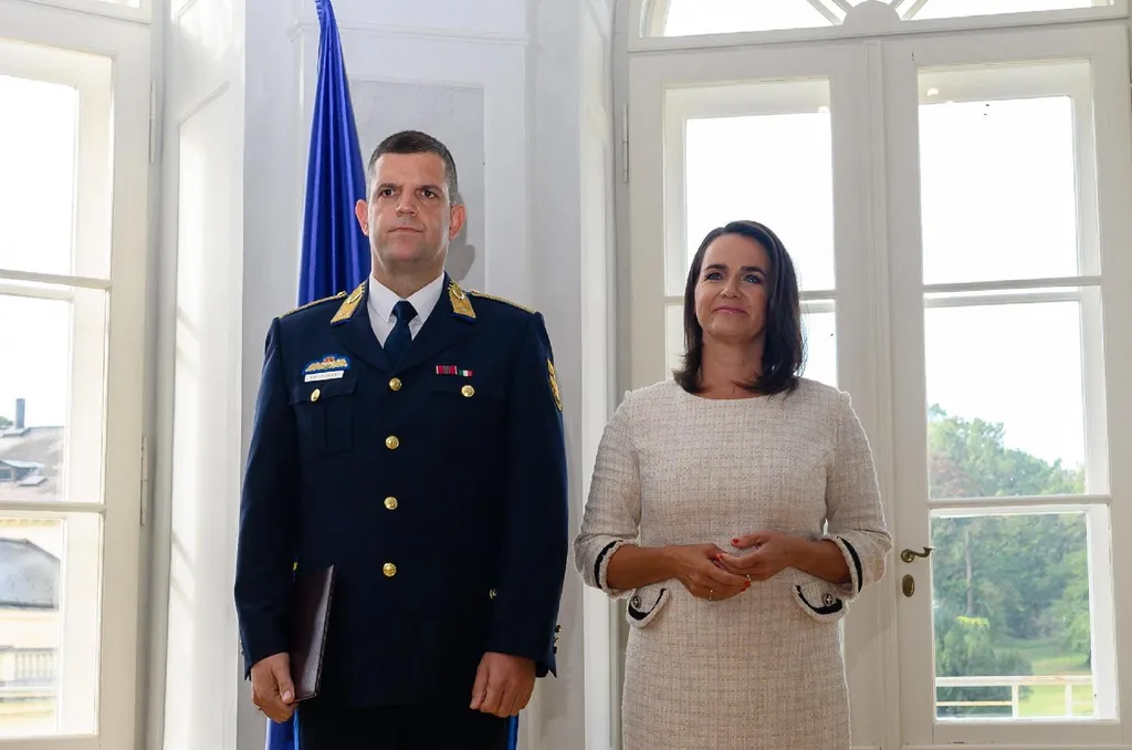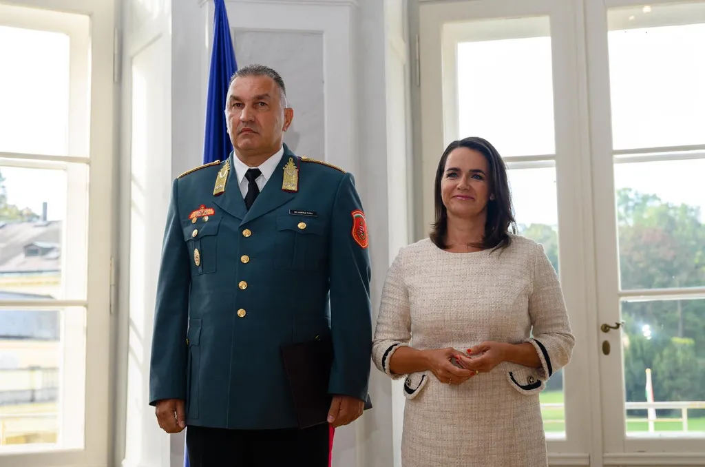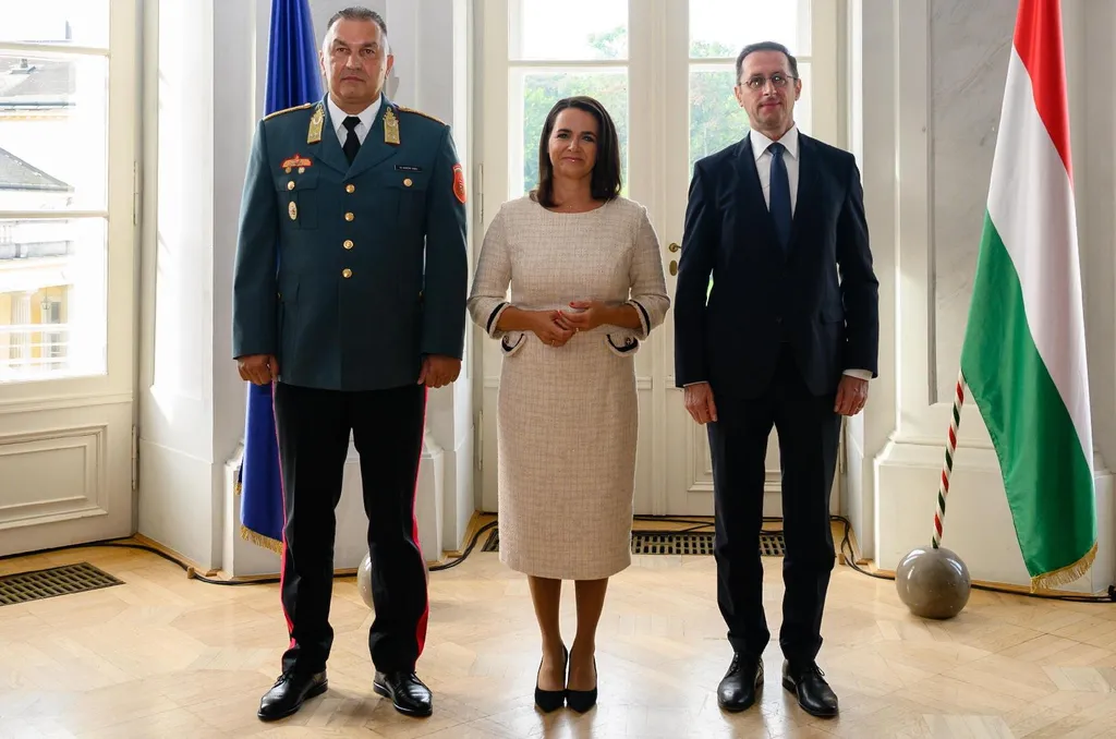 Novák Katalin Fejér vármegyei látogatásának második napján - Szalay-Bobrovniczky Kristóf, valamint Pintér Sándor belügyminiszter és Varga Mihály pénzügyminiszter, Böröndi Gábor vezérezredes, vezérkari főnök, Ibolya Tibor legfőbb ügyész helyettes, továbbá a családtagok jelenlétében - adta át az október 23-ai hatállyal életbe lépő okiratokat.