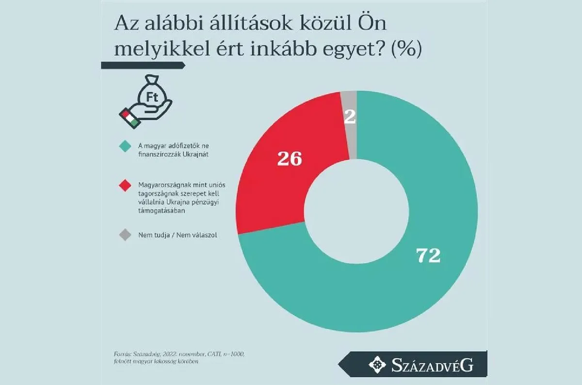 A közvélemény-kutatás - az Európai Unió mellett - kitért Magyarország szerepvállalásának megítélésére is Ukrajna pénzügyi támogatásában. Megállapítható, hogy a megkérdezettek csaknem háromnegyede - 72 százaléka - elutasítja, hogy magyar adófizetők finanszírozzák Ukrajnát.