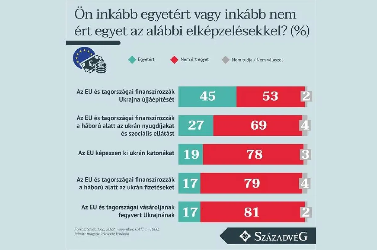 A felmérés szerint a magyarok 53 százaléka ellenzi, hogy az Európai Unió és tagországai finanszírozzák Ukrajna helyreállítását. Ehhez hasonlóan a megkérdezettek több mint kétharmada - 69 százaléka - nem ért egyet azzal, hogy az Európai Unió és tagállamai finanszírozzák a háború alatt az ukrán nyugdíjakat és szociális ellátást, továbbá több mint háromnegyedük - 79 százalékuk - nem támogatja, hogy a fegyveres konfliktus tartama alatt az ukrán fizetéseket európai pénzekből fedezzék.
