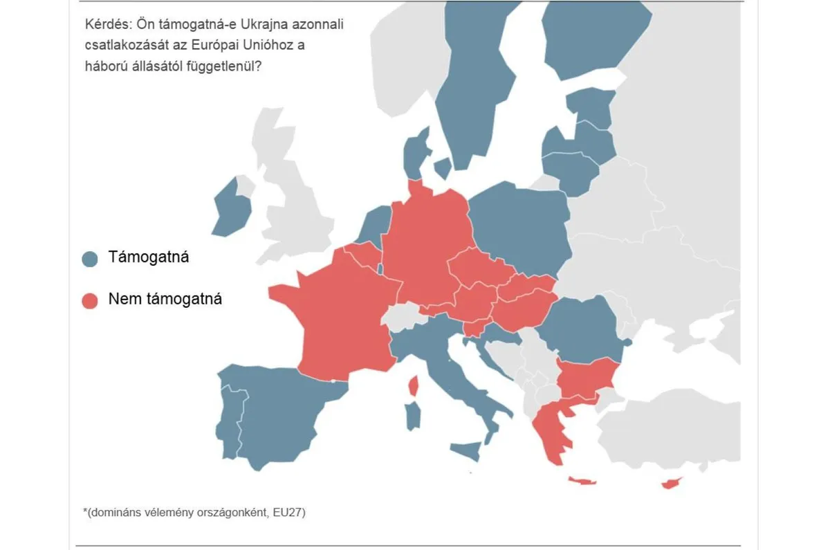 Azoknak az aránya, akik – a háború állásától függetlenül – ellenzik Ukrajna gyorsított csatlakozását az Európai Unióhoz, 11 tagországban meghaladja a lépést támogatók táborát, ezzel szemben 16 tagállamban a csatlakozást pártolók aránya a magasabb - írták.