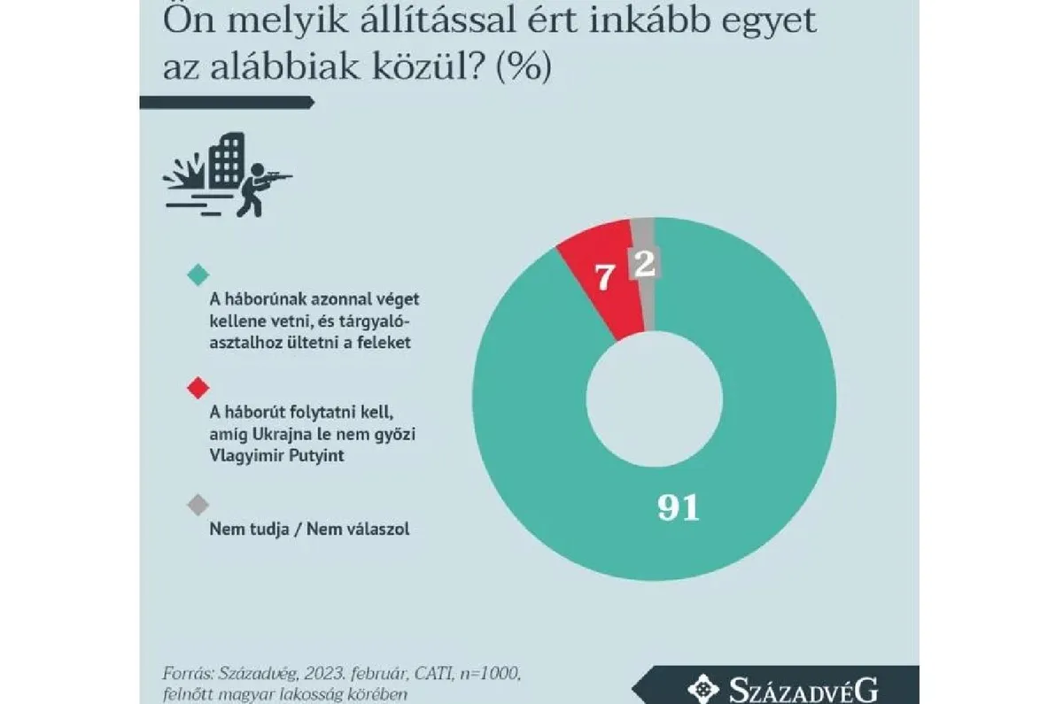 A kutatás rávilágított arra, hogy "Magyarországon társadalmi konszenzus alakult ki a fegyveres konfliktus mielőbbi lezárása, a harci műveletek azonnali beszüntetése mellett". Megállapítható az is, hogy a magyarok 91 százaléka szerint az orosz-ukrán háborúnak azonnal véget kellene vetni, és tárgyalóasztalhoz ültetni a feleket - olvasható a közleményben.