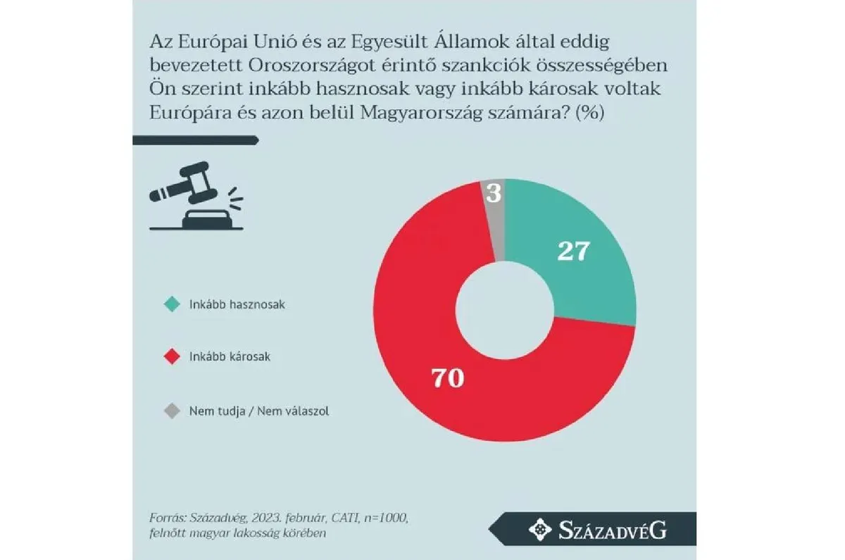 A Századvég a szóban forgó nemzetközi kritikák kapcsán megvizsgálta az orosz-ukrán fegyveres konfliktussal, illetve Brüsszel és a Biden-adminisztráció szankciós politikájával kapcsolatos lakossági attitűdöket.