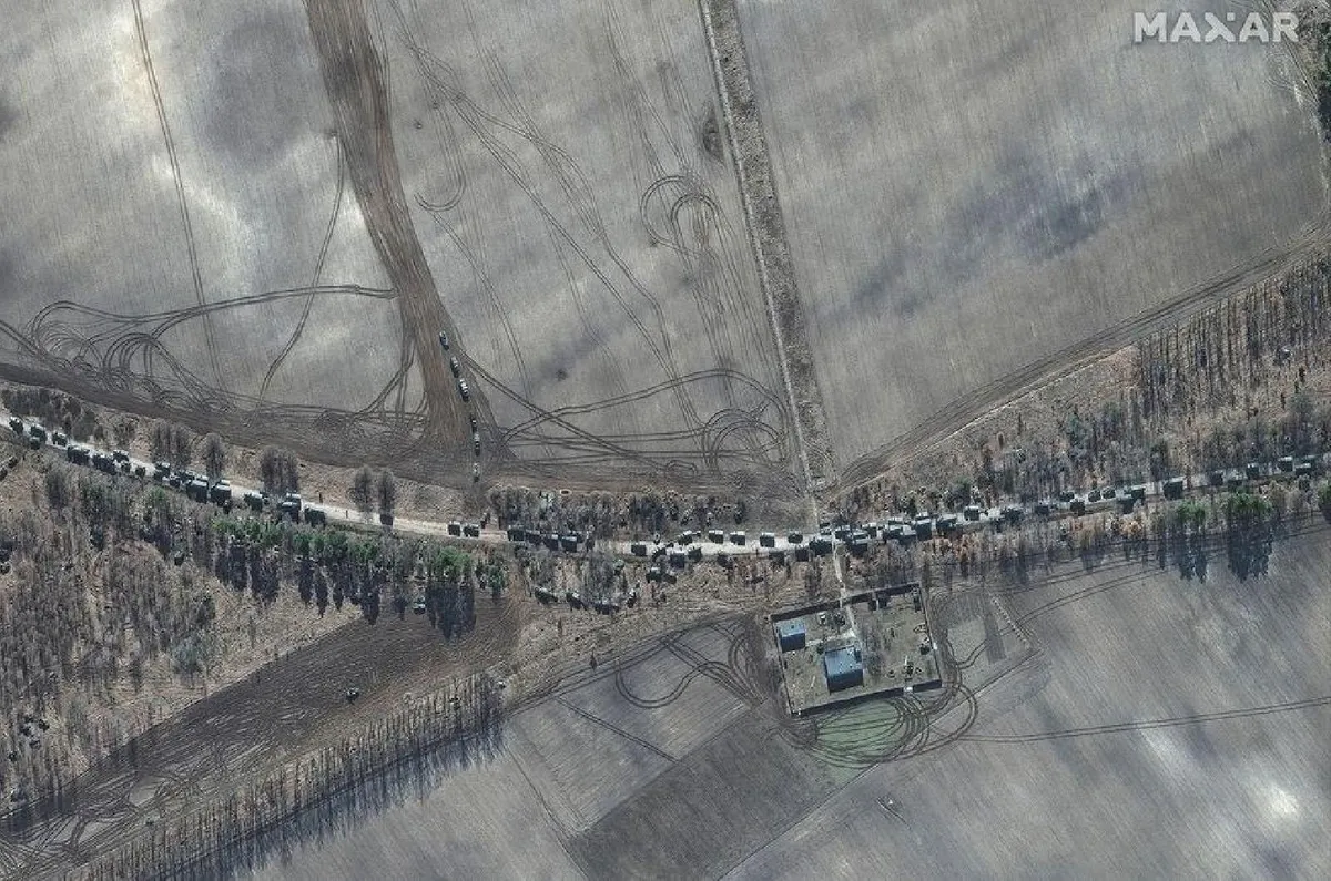 A felvételek szerint az oroszok átcsoportosítják erőiket. Páncélos egységeket láttak az ukrán fővárostól északra található Antonov repülőtérhez közeli településeken. A Maxar szerint több jármű bevonult az erdőbe, és a közelben található ágyúk tüzelésre készen állnak. A katonai járműveket a múlt héten vonták össze Kijev közelében, de úgy tűnt, hogy az elmúlt időszakban nem haladt a konvoj. Médiaértesülések szerint az előrenyomulás élelmiszer- és üzemanyaghiány miatt rekedt meg. Amerikai tisztségviselők elmondták, hogy az ukrán csapatok rakétákkal támadták a konvojt.
