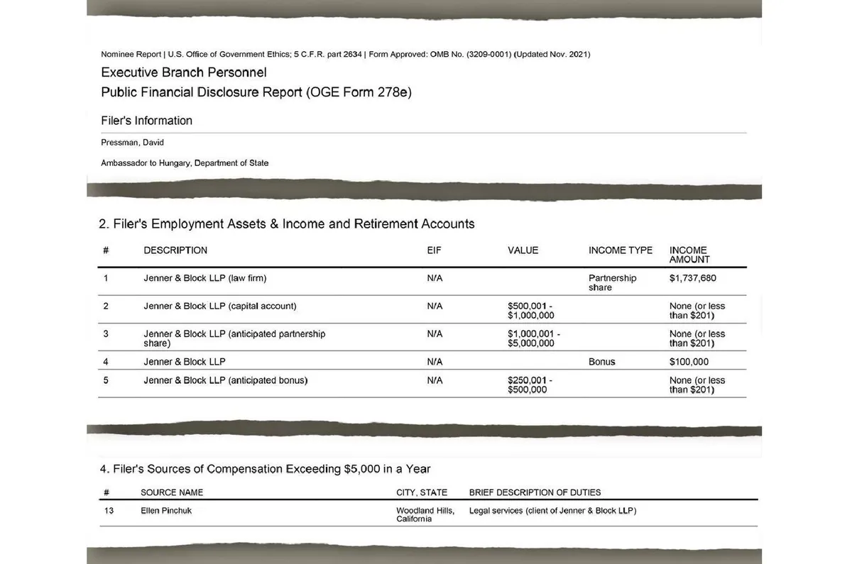 Pressman budapesti nagyköveti kinevezése kapcsán napvilágot látott egy nyilvános pénzügyi nyilatkozat, melyben fel kellett tüntetnie, hogy a kinevezését megelőző években milyen anyagi forrásokkal rendelkezett. Ebben szerepel egy bizonyos Ellen Pinchuk, lakcíme Woodland Hills, Kalifornia, akitől több mint 5000 dollár bevétele származott jogi tanácsadás címen, s aki a Jenner & Block ügyfele volt. Tehát 2020 és 2022 között.
