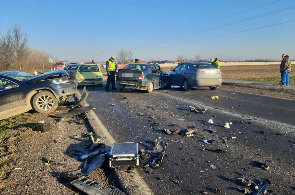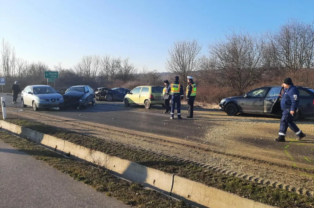 A rendőrség közleménye szerint egy utánfutón sódert szállító autós - eddig tisztázatlan körülmények között - nekihajtott három másik járműnek. A baleset következtében három embert szállítottak kórházba a mentők.
