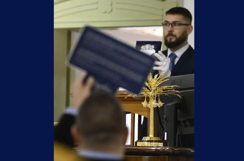 Kiemelte: a szombati aukción a legnagyobb értékű elkelt tárgy az aranyból készült datolyapálma gyöngyfüzérekkel, amelyet 7 millió forintért vettek meg.