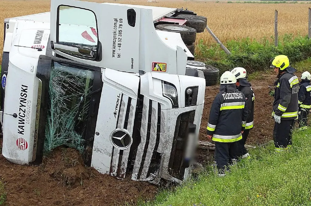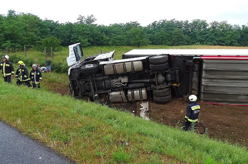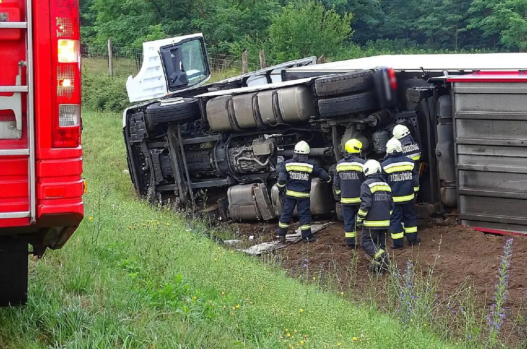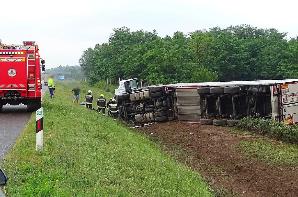 A több tonna húst szállító teherautó sofőrje vélhetően elaludt, ezért tért le az útról Csengele közelében. Átszakította a vadhálót, végül az oldalára borulva állt meg az árokban.