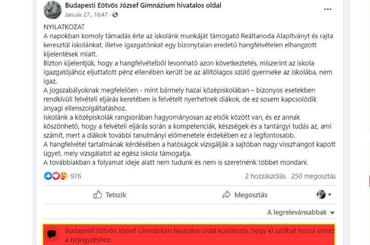 Miután folyamatosan érkeztek a kritikus vagy kényes kérdéseket feszegető kommentek - többen kijelentették, hogy már évek óta nyílt titok volt az iskolában, hogy pénzért is be lehet jutni, mások közölték, ma már szégyellik, hogy egyáltalán ide jártak – váratlanul teljesen kikapcsolták a hozzászólási lehetőséget.