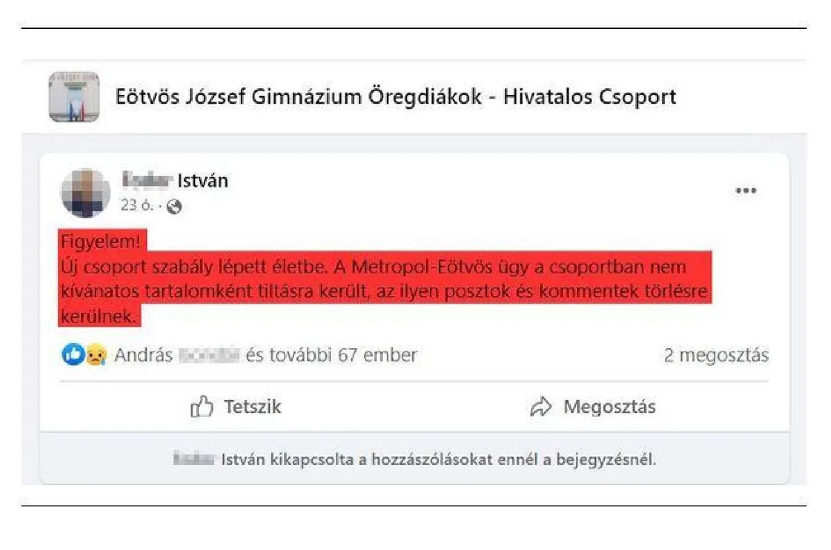 „Új csoport szabály lépett életbe. A Metropol-Eötvös ügy a csoportban nem kívánatos tartalomként tiltásra került, az ilyen posztok és kommentek törlésre kerülnek” – közölte az admin.