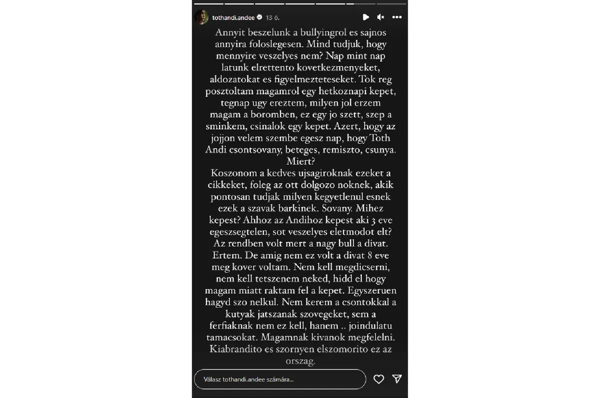 Andi hétfőn tette közzé az alábbi bejegyzést magáról, ami után valósággal felrobbant az internet. Rengeteg bántó kommentet kapott a posztjára, amiben rend szerint az alakjára tettek megjegyzéseket. „Aggódom, nem kellene tovább fogyni!” – írta egyikük, egy másik kommentelő pedig hozzáfűzte, hogy aggasztóan soványnak tartja Andit, ami miatt szerinte az arca is előnytelenül megnyúlt. Az énekesnő nem bírta tovább, néhány órával később 24 óráig megtekinthető Instagram-bejegyzésében válaszolt rosszakaróinak.