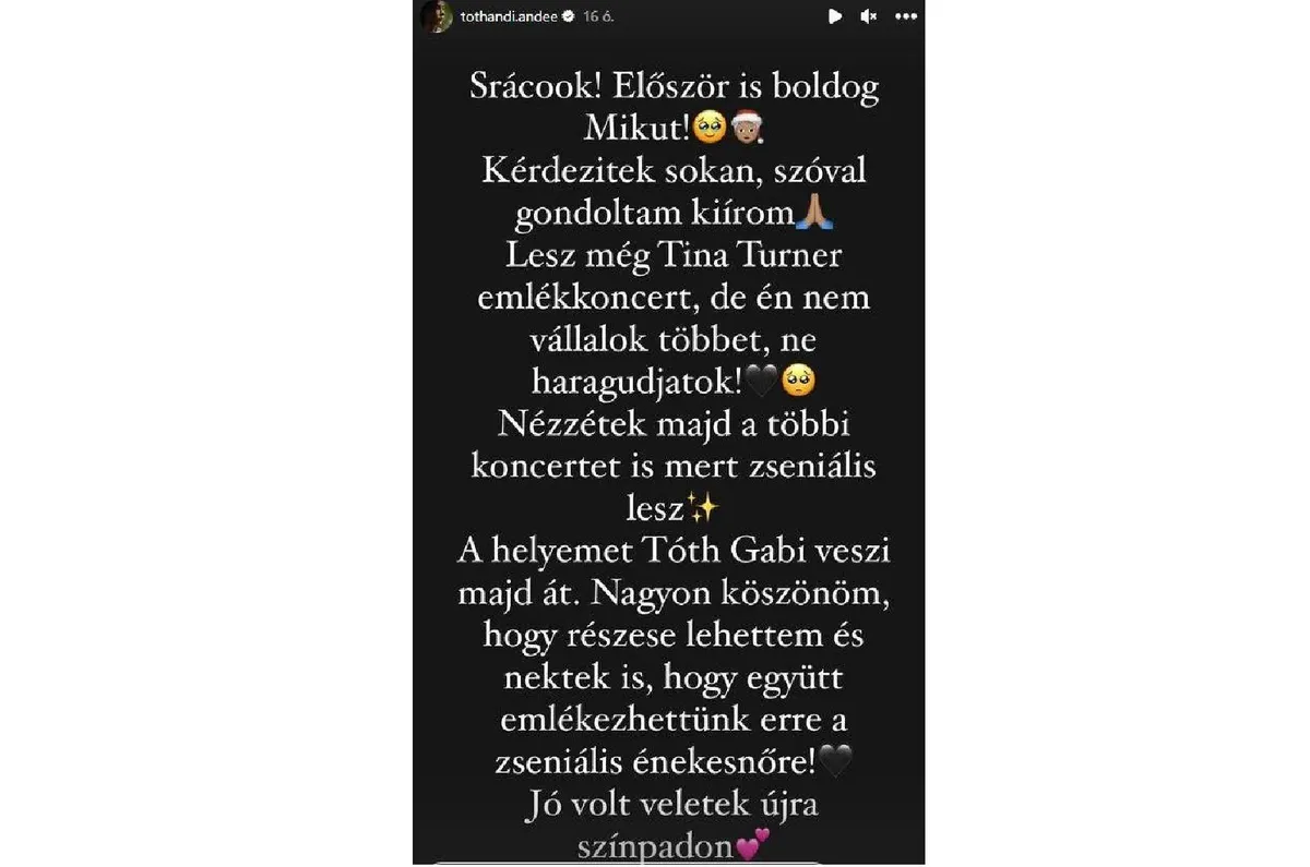 Szerdán azonban váratlan fordulat történt, ugyanis Andi bejelentette, hogy nem vállal több Tina Turner emlékkoncertet, az előadásokon Gabi veszi majd át a helyét.
