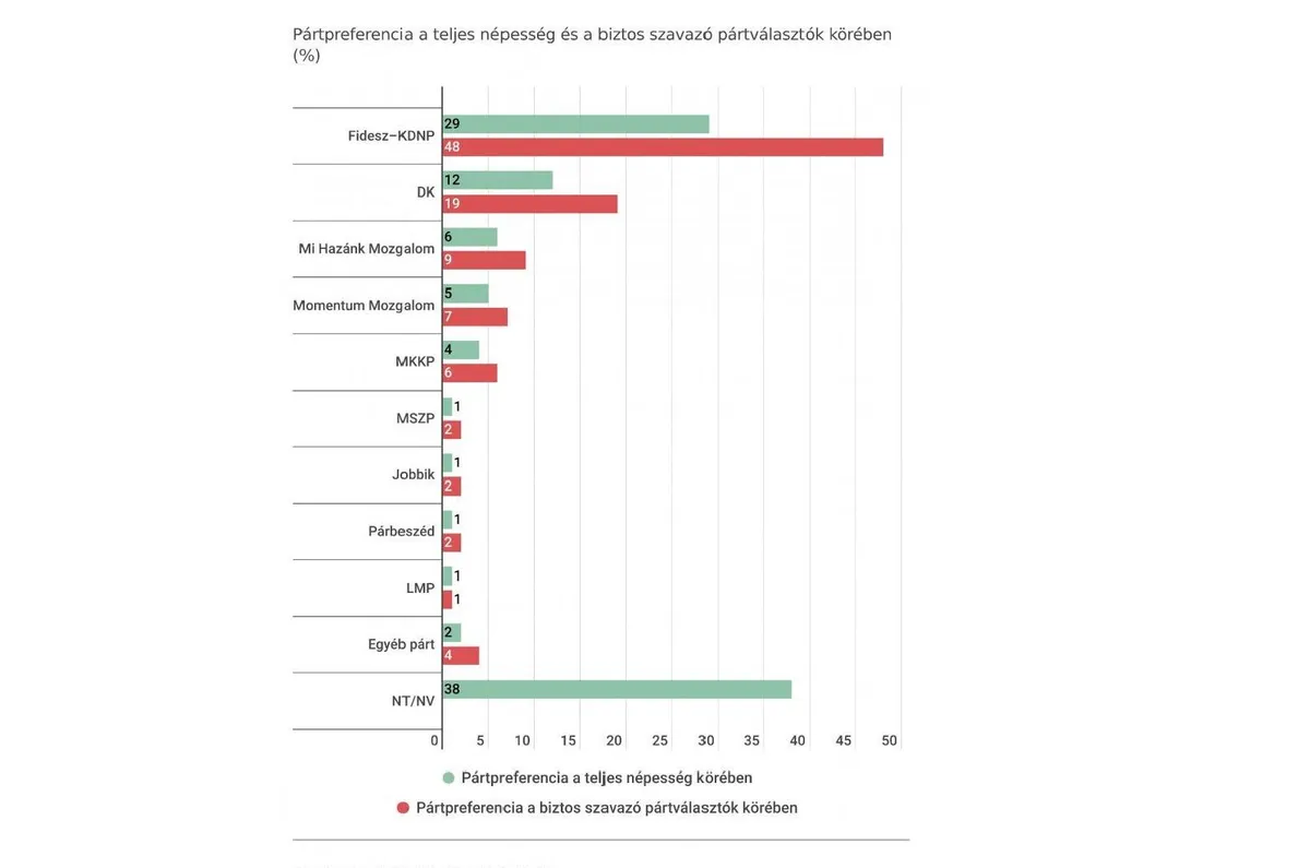Viszont a többi, jelenleg parlamenti mandátummal rendelkező többi párt 1-1 százalékon áll. Ez a négy párt az LMP, a Jobbik, az MSZP és a Párbeszéd. A Magyar Kétfarkú Kutya Pártnak pedig négyszázalékos támogatottsága van. Az ismeretlen preferenciájúak aránya ugyanakkor ismét emelkedett 2 százalékponttal, így már 38 százalékon áll.